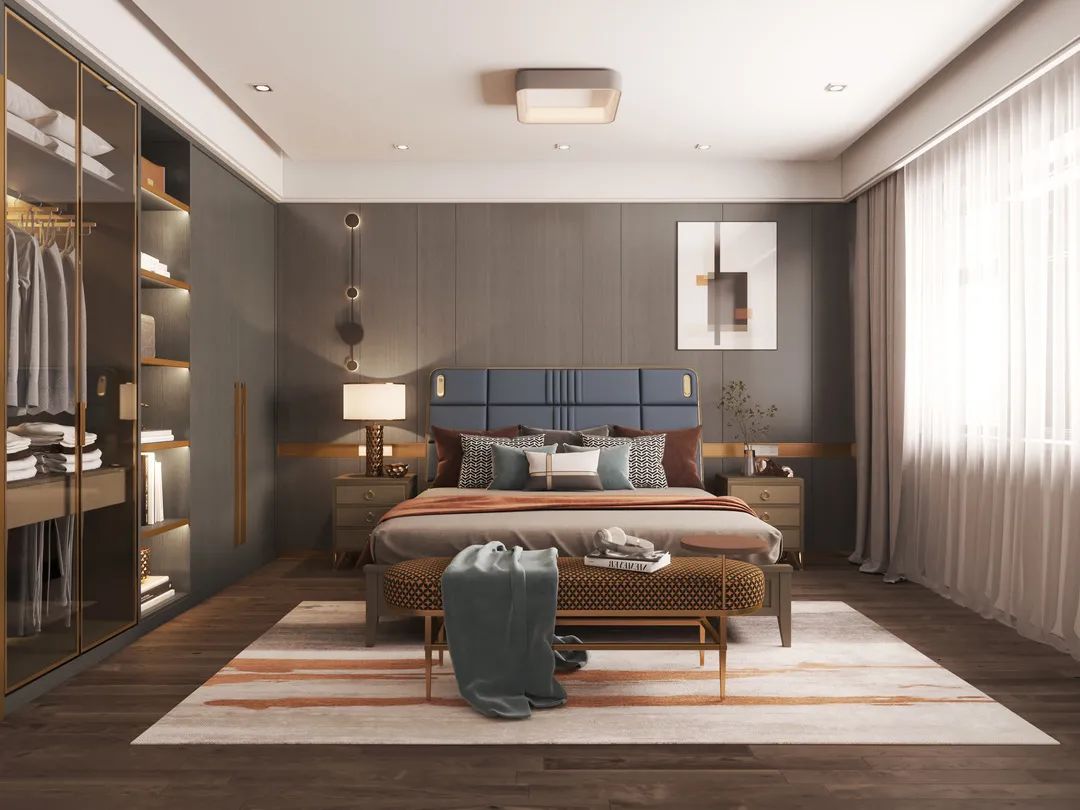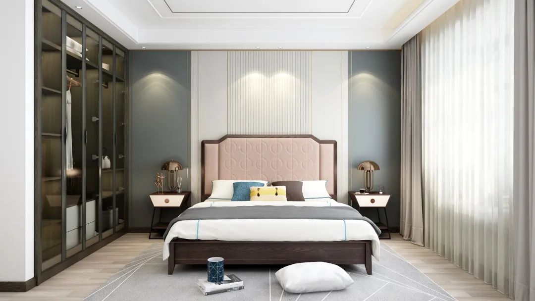 优雅沉静的雾霾蓝床架,干净利索的线条设计,天然的皮革纹路,与原木色的墙面相呼应,纯粹、朴实,营造出轻奢简约的氛围,满足了屋主对空间的无限畅想。