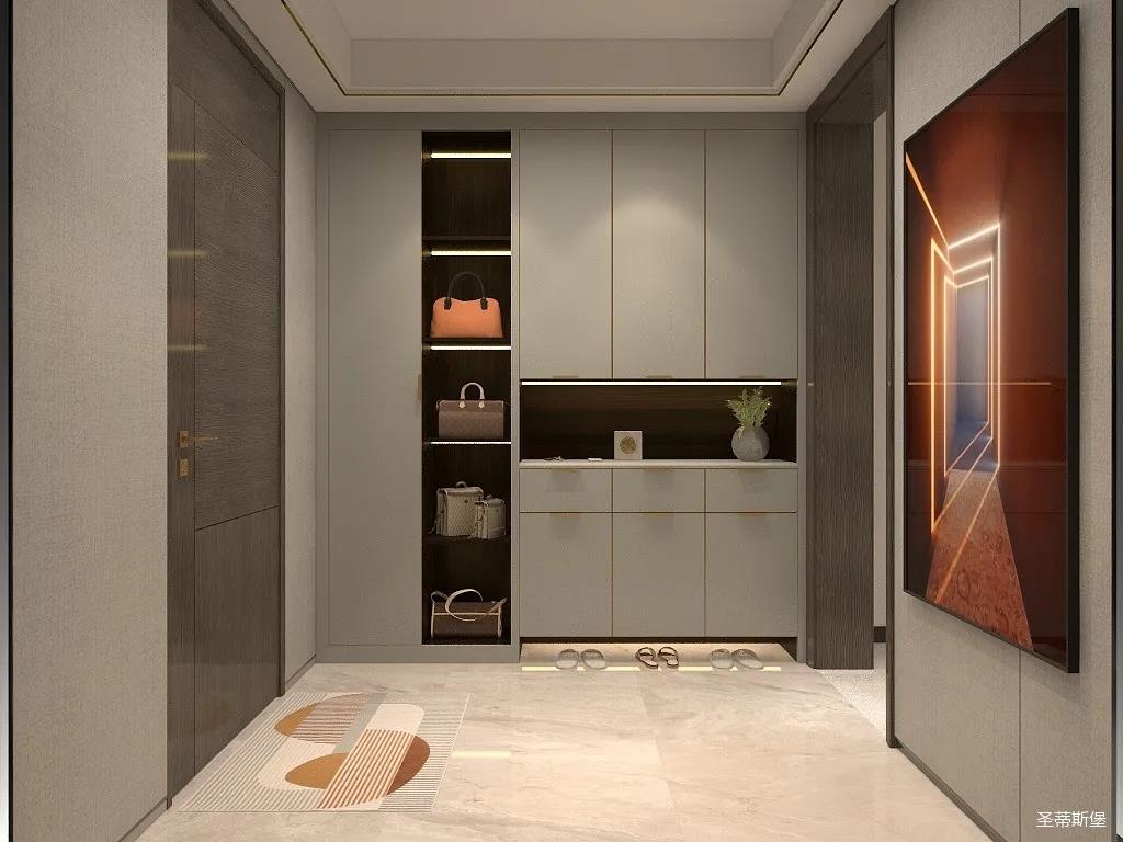 玄关表达的不仅仅是艺术精致,更多是业主气质的独有印记。一迈入空间,便能找到家的归属感。玄关定制柜将最纯粹的色调融入空间,高级浅灰色系加入淡淡的金属材质,提升家的温馨感,高级感。入门处可视储物区与隐秘区域完美划分,既做到了完美收纳又点缀着空间时尚。