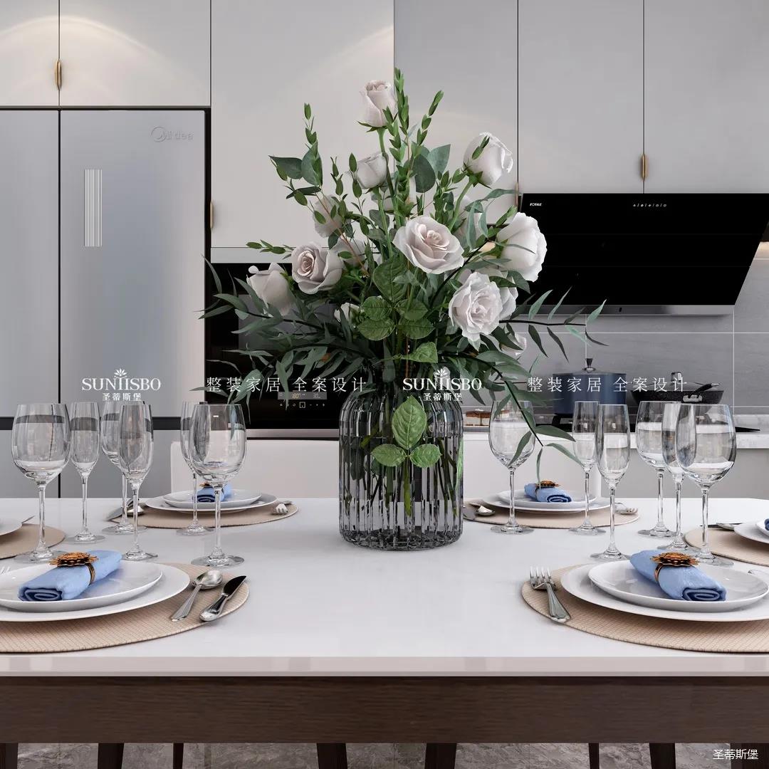 餐厨采用开放式布局,实现开阔明朗的公共空间,也提高了居家交流互动的便利性。减少不必要的物件,加上合理的设计,布局出和谐安全的居家环境。